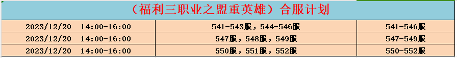 为了活跃游戏气氛,满足玩家需求,让广大玩家可以延续更激烈的战斗,我们将于以下时间进行合服操作,合服期间玩家将不能登录游戏,请各位玩家知晓并相互转告,感谢大家的支持!服务器会根据维护操作完成时间提前或延迟开启!不便之处敬请体谅!合区时间:2023/12/20 14:00-16:00